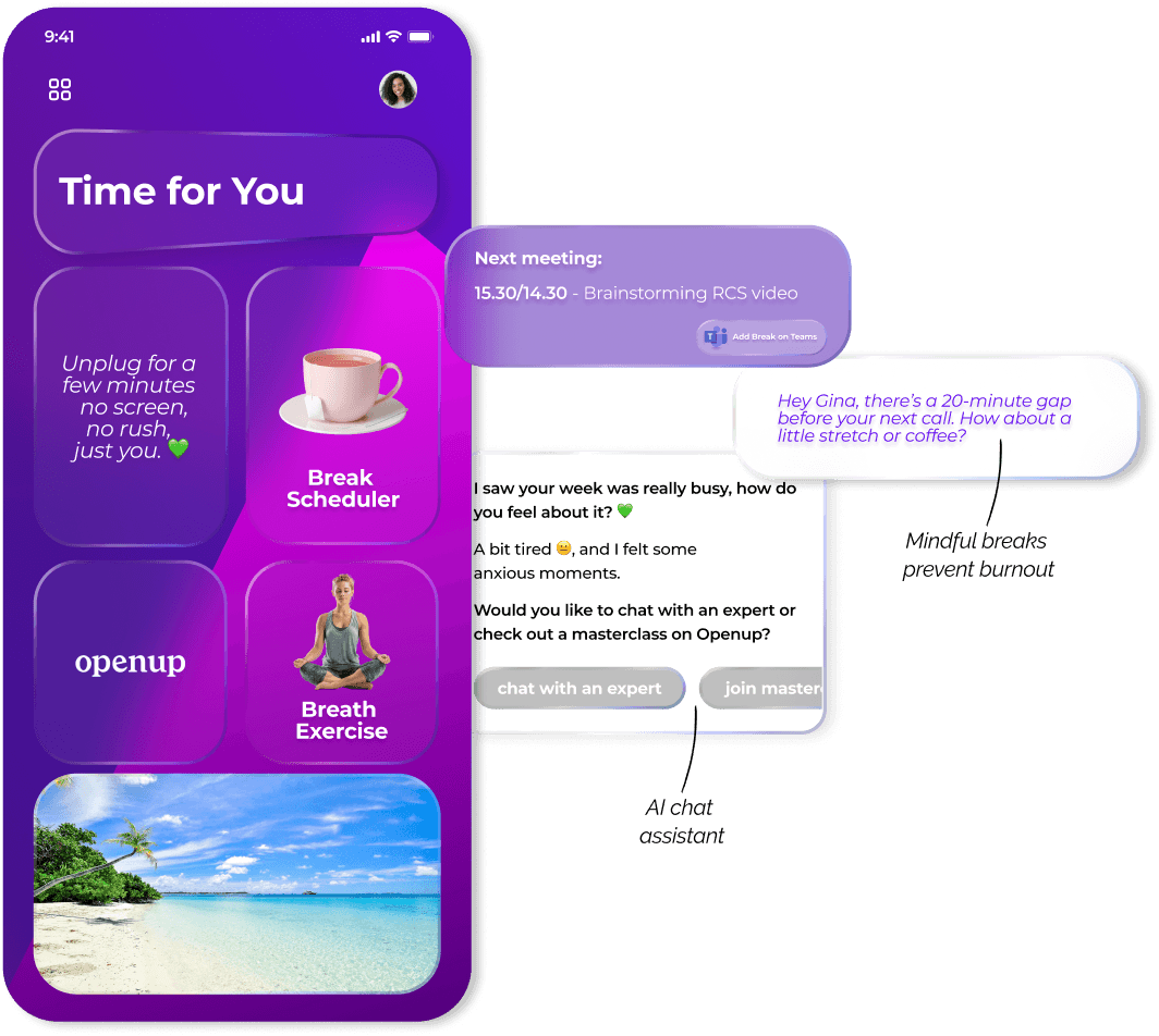 AI detects stress patterns and suggests mindful breaks at the right moment.