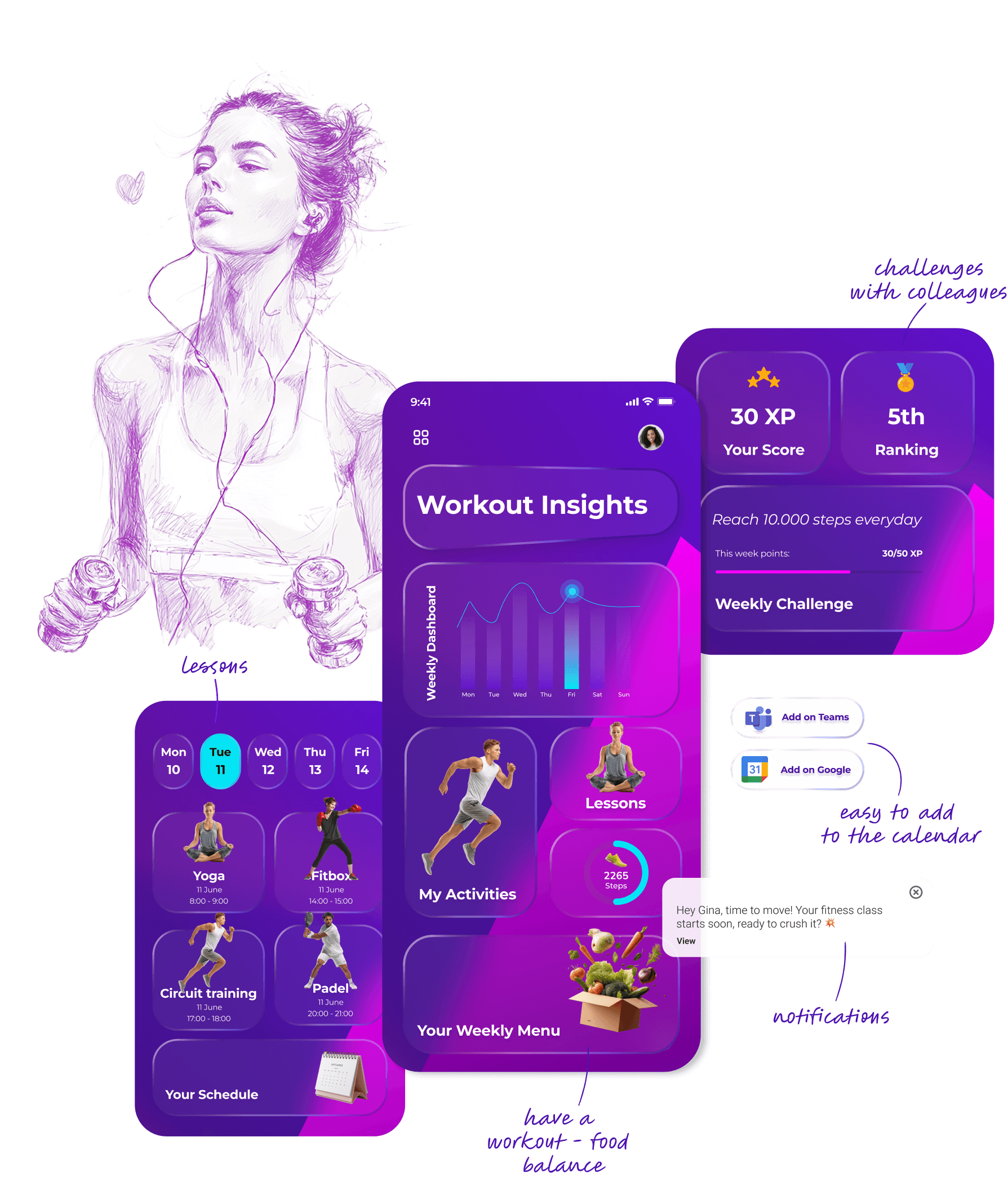 Adaptive workouts suggested by AI, tailored to energy levels and available time.